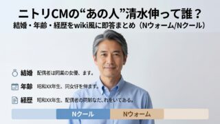 「ニトリのCMでいつも寝てる(歌ってる)男性、あれ誰?」の答えは——俳優の清水伸(しみず・しん)さんです。 ここでは“毎日にほんのちょっぴりスパイスを♪”らしく、気になる疑問に即答で、プロフィールをwiki風にサクッと整理します(2026年4月時点)。 結論:清水伸は何者?一言でいうと ニトリ(Nウォー